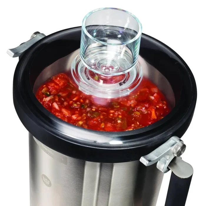 Le mixeur alimentaire Hamilton Beach EXPEDITOR HBF1100S est spécialement conçu pour les professionnels de la restauration à la recherche d’un appareil performant et durable. Doté d’un récipient de 4 litres en acier inoxydable et d’un moteur puissant de 1,5 kW avec un couple élevé de 3,5 CV, ce mixeur garantit une grande polyvalence. Grâce à son système breveté Wave Action®, il assure une émulsion homogène en poussant continuellement les ingrédients vers les lames, évitant ainsi les interventions manuelles.